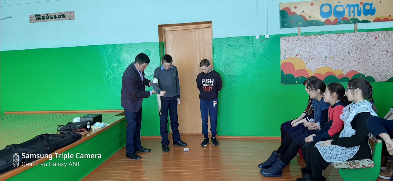 Учащиеся 8 класса Бикметов Асхат и 7 класса Муллагулов Фануз, вместе с преподавателем – организатором ОБЖ Кутлубаевым А.Я. провели занятие «Оказание первой медицинской помощи при различных видах повреждений» для учащихся 5-8 классов.
