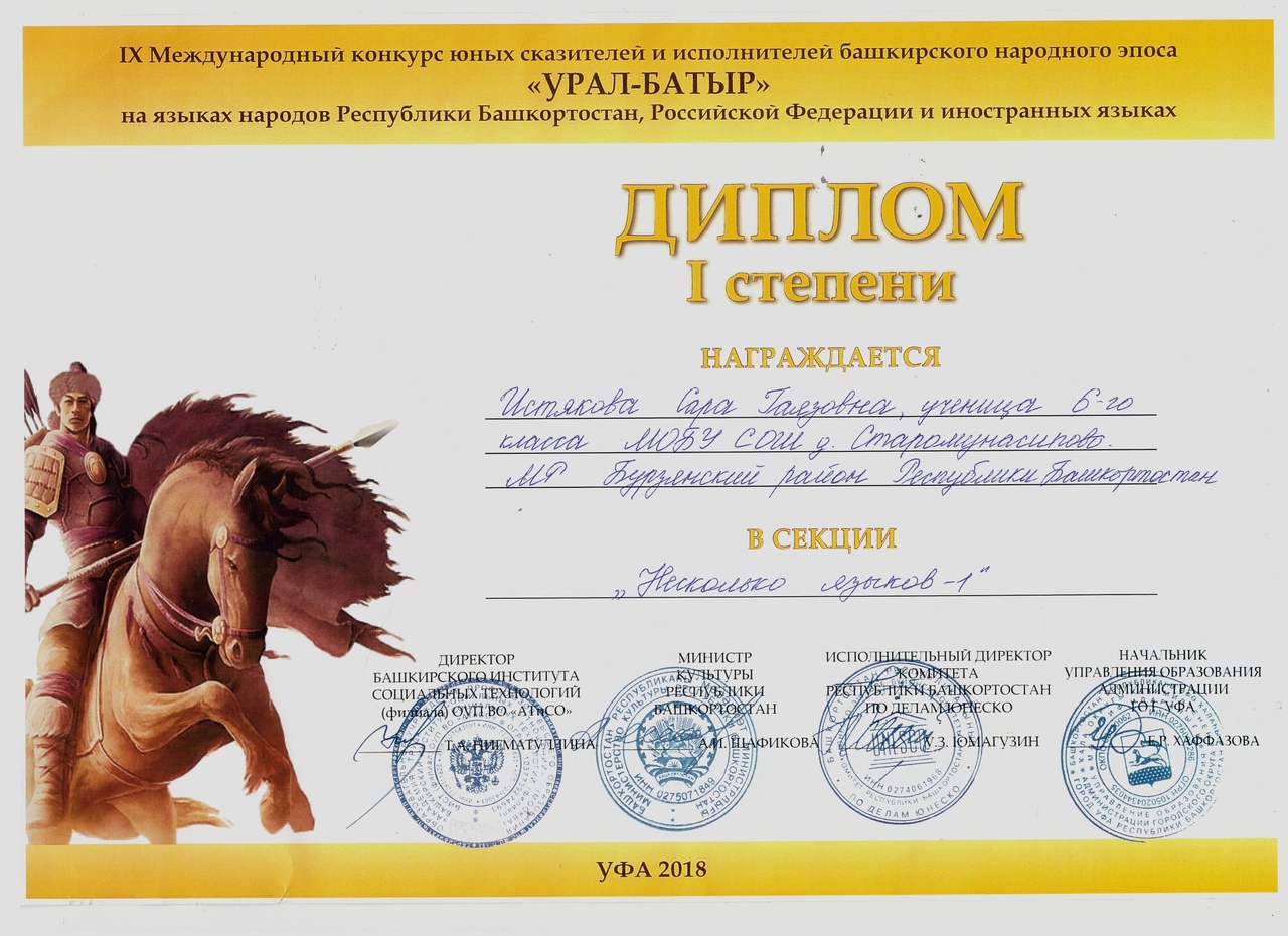 Обучающаяся VI класса МОБУ СОШ д. Старомунасипово Истякова Сара выступила в секции "Несколько языков - 1". Она исполнила отрывки из эпоса "УРАЛ - БАТЫР" на башкирском и турецком языках, завоевала I место.