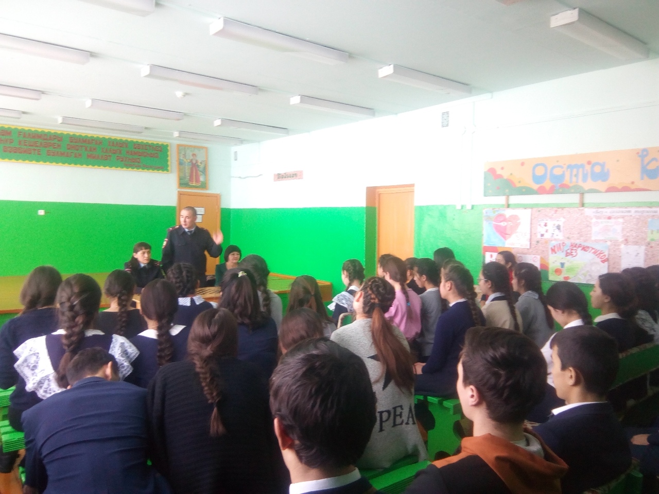 23 ғинуарҙа беҙҙең мәктәптә Бөрйән районы хакимиәтенең Бәлиғ булмағандар эштәре буйынса комиссия ағзалары, хоҡуҡ һаҡлау органдары хеҙмәткәрҙәре уҡыусылар менән осрашыу үткәрҙе. Был осрашыуға полиция майоры Алтынбаев Артур Насибулла улы, полиция капитаны, Бәлиғ булмағандар эштәре буйынса комиссияның өлкән инспекторы Ҡотоева Дилә Рәмил ҡыҙы, Бәлиғ булмағандар эштәре буйынса комиссия рәйесе Тажитова Ләйсән Шәкирйән ҡыҙы, район хакимиәтененең опека һәм попечителлек секторының әйҙәүсе белгесе Вәхитова Айгөл Һатыбал ҡыҙы килгән ине. Осрашыуҙың төп маҡсаты бәлиғ булмаған балаларға закон ҡағиҙәләрен аңлатыу булды. Быйылғы йылда Бөрйән районында бәлиғ булмаған балалар тарафынан ҡылынған енәйәт эштәре тураһында һөйләп, уҡыусыларҙы аңлы булырға саҡырҙылар, уларға һәр бер ҡылынған яман эш өсөн яуаплылыҡты, законды белмәү язанан ҡотҡармау тураһында аңлаттылар. Уҡыусылар осрашыуҙан йәмғиәттәге тәртип, закондар тураһында күп кенә мәғлүмәт алдылар.